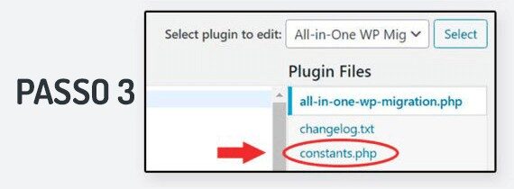 Após selecionar o plugin All-in-One WP Migration, você será levado para a tela do editor de plugins. Procure o arquivo denominado “constants.php” e clique nele para abrir o arquivo.