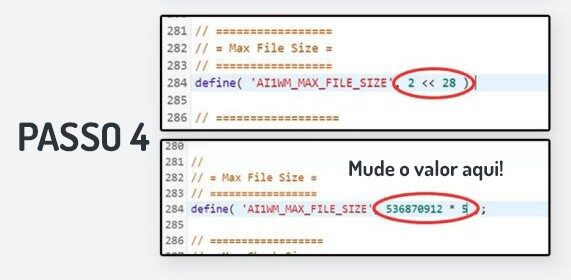 Esta linha de código define o tamanho máximo do arquivo para upload em 512 MB. Para aumentar este limite, será necessário alterar o valor da constante “AI1WM_MAX_FILE_SIZE”.